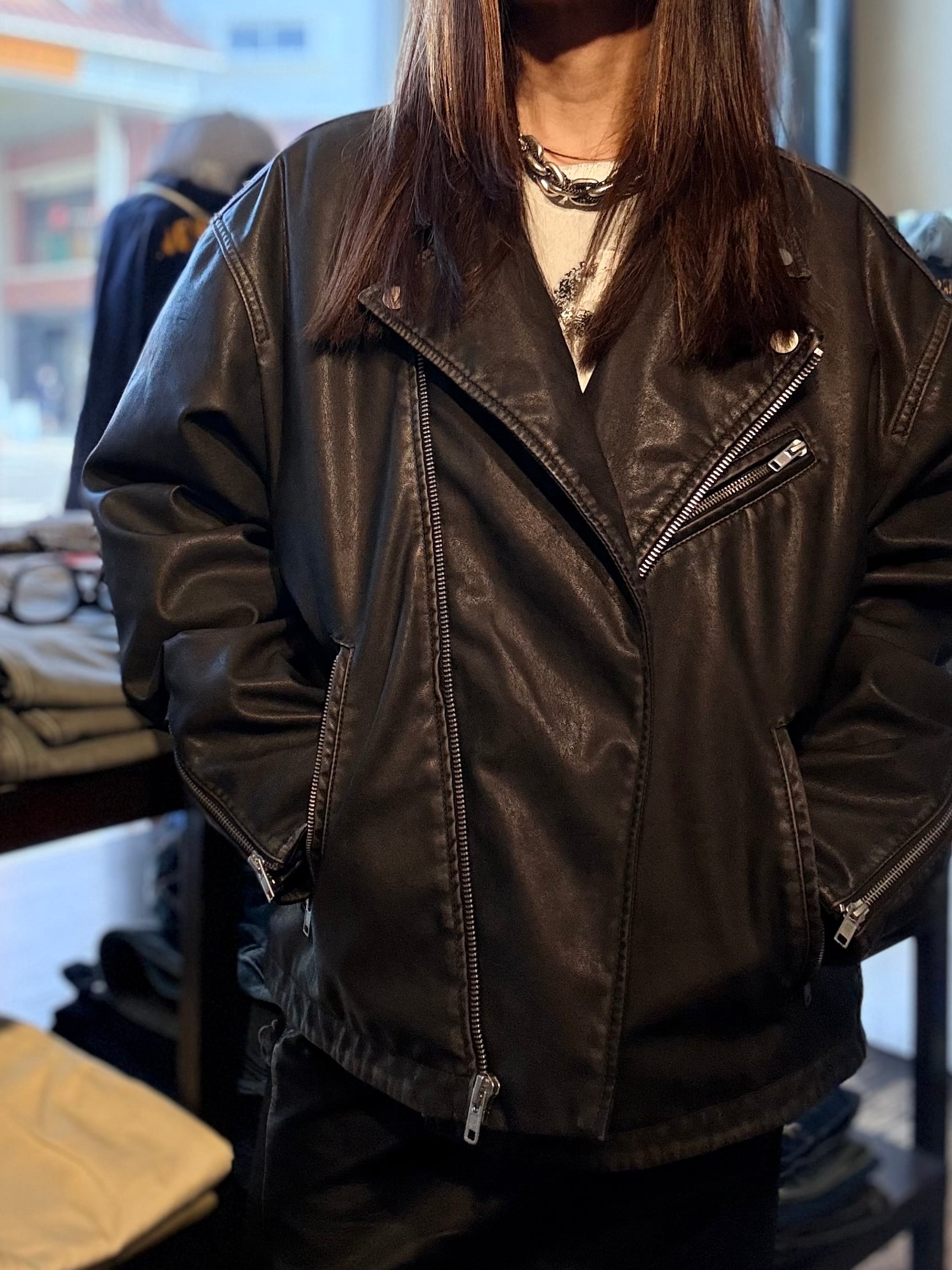 synthetic leather の ライダースジャケット。