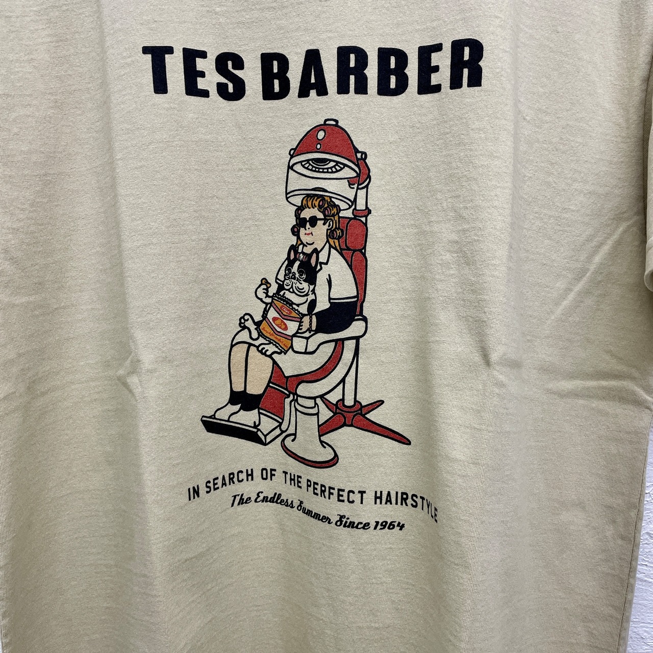 カリフォルニアの昔の美容院をイメージし、レトロなタッチで描いた作品。 ボディは洗い晒しの様な風合いが特徴のアメリカンコットンを忠実に日本生産にて再現したオリジナルヘビーウェイト天竺を採用した半袖Tシャツです。 度目を詰めながらも柔らかさを出し、堅牢さを兼ね備えた抜群の着心地に仕上げています。